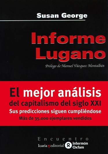 ¿Qué recomendarle a quien desee mantener el capitalismo durante el siglo XXI? Un grupo de trabajo multitudinario, convocado por los líderes mundiales para analizar el futuro de la economía planetaria, llega a la conclusión que ésta está torpemente gestionada, bajo la amenaza de sus propios excesos se dirige hacia el colapso ecológico y es una mala candidata para sobrevivir a largo plazo. Según tales perspectivas ¿Cómo podrían los ganadores del juego de la globalización asegurarse un futuro confortable? Hay un modo, aunque sea pavoroso. El Informe Lugano se interna en nuevos territorios, armado de una lógica inexorable que va del diagnóstico más frío a la cura más estremecedora.Si esto es el futuro que nos aguarda, nos sentiremos impulsados a buscar opciones diferentes. En su apéndice y epílogo, la autora recusa las conclusiones del grupo de trabajo y propone soluciones alternativas. El Informe Lugano es el libro más ambicioso de Susan George hasta la fecha. En él, la autora asume una perspectiva totalmente diferente, mucho más audaz que en sus anteriores obras. Entre éstas cabe mencionar clásicos como: Como muere la otra mitad del mundo; La trampa de la deuda, Enferma anda la Tierra, El bumerán de la deuda y La religión del crédito.