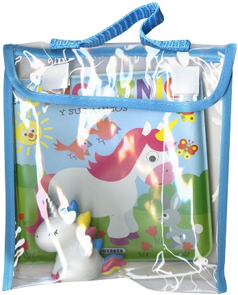 Un libro de plástico acolchado con ilustraciones a todo color de un simpático unicornio y sus amigos, y un muñeco de goma pensado para que los más pequeños de la casa disfruten siempre de la hora del baño.