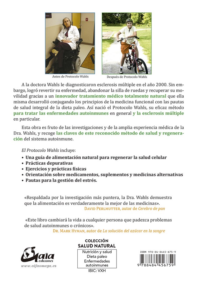 A la doctora Wahls le diagnosticaron esclerosis múltiple en el año 2000. Sin embargo, logró revertir su enfermedad, abandonar la silla de ruedas y recuperar su movilidad gracias a un innovador tratamiento médico totalmente natural que ella misma desarrolló conjugando los principios de la medicina funcional con las pautas de salud integral de la dieta paleo. Así nació el Protocolo Wahls, su eficaz método para tratar las enfermedades autoinmunes en general y la esclerosis múltiple en particular. Esta obra es fruto de las investigaciones y de la amplia experiencia médica de la Dra. Wahls, y recoge las claves de este reconocido método de salud y regeneración del sistema autoinmune. El Protocolo Wahls incluye: • Una guía de alimentación natural para regenerar la salud celular • Prácticas depurativas • Ejercicios y prácticas físicas • Orientación sobre medicamentos, suplementos y medicinas alternativas • Pautas para la gestión del estrés